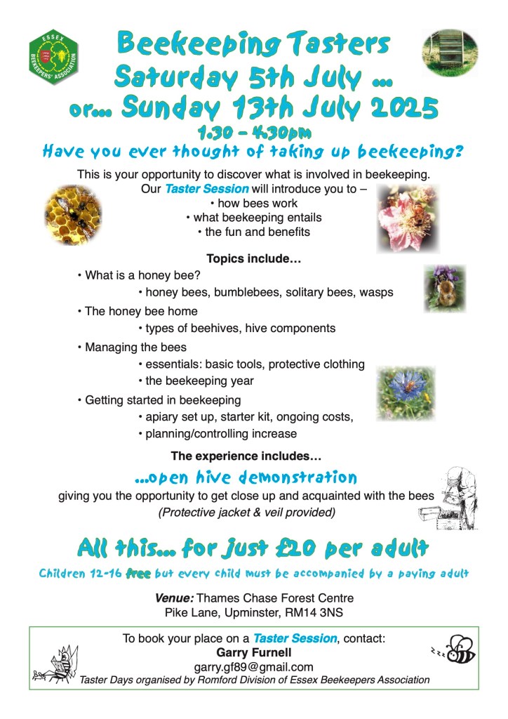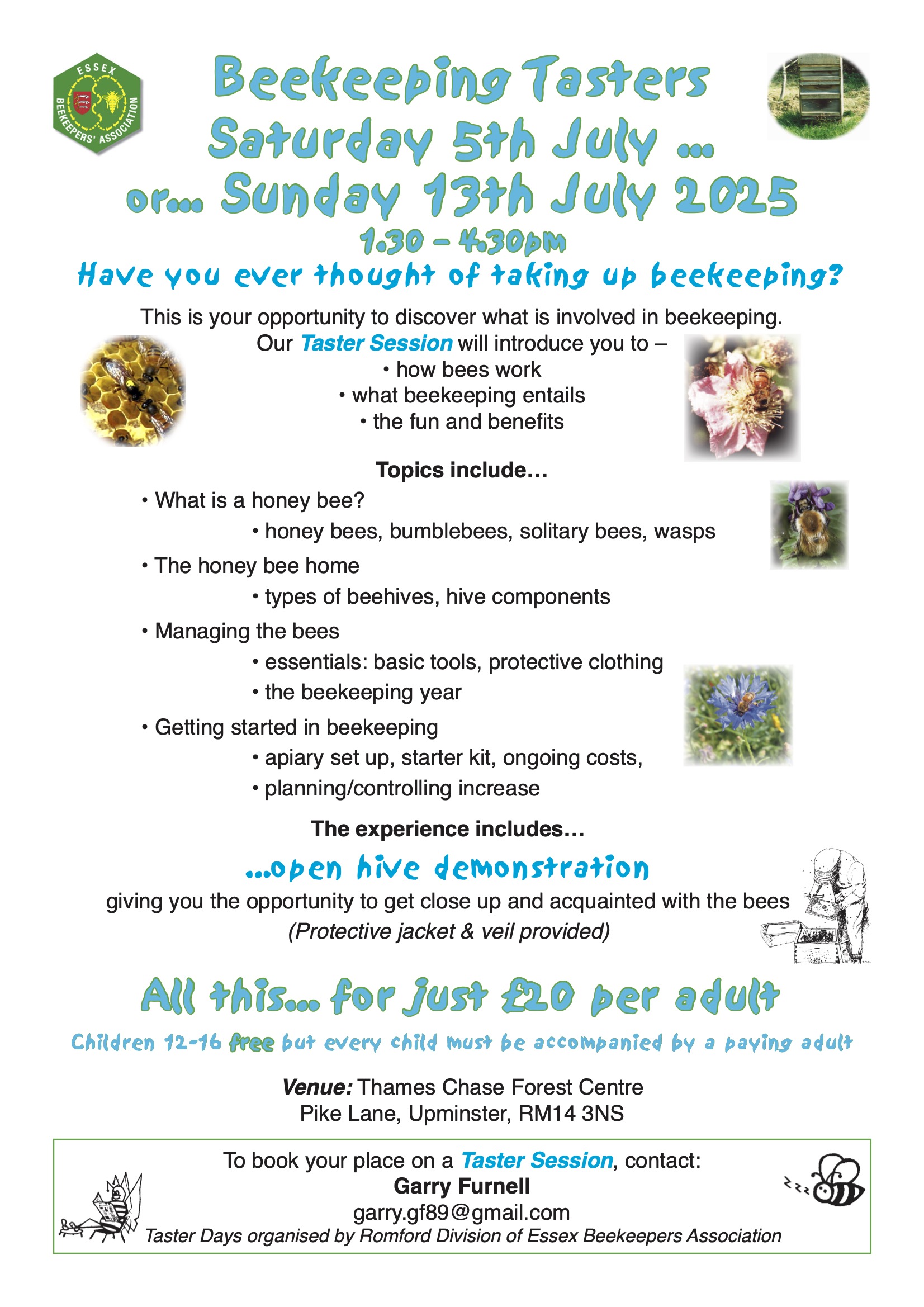 Romford Beekeepers is running TWO beekeeping taster sessions in 2025 – Saturday 5th July and Saturday 15th July – between 1.30pm and 4.30pm.