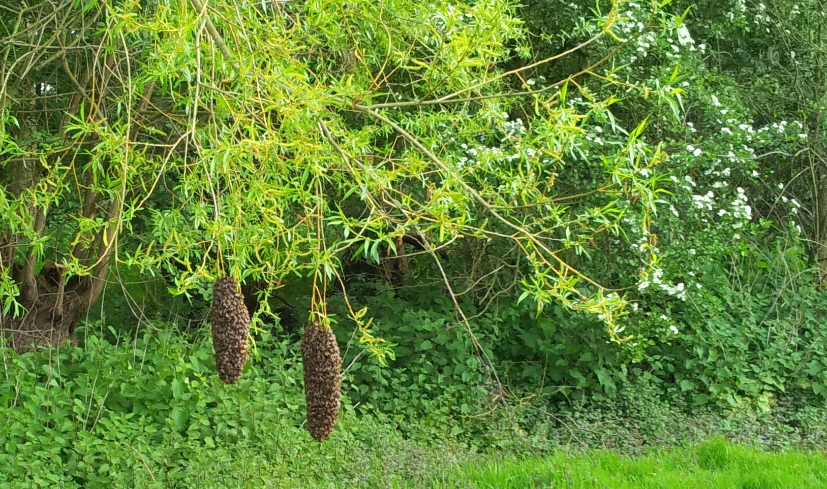 Typically the swarm rests in a tree or bush (as in the picture above) for anything between an hour and a couple of days. A swarm will normally move on and the bees in a swarm will ignore you unless they feel you are threatening them.